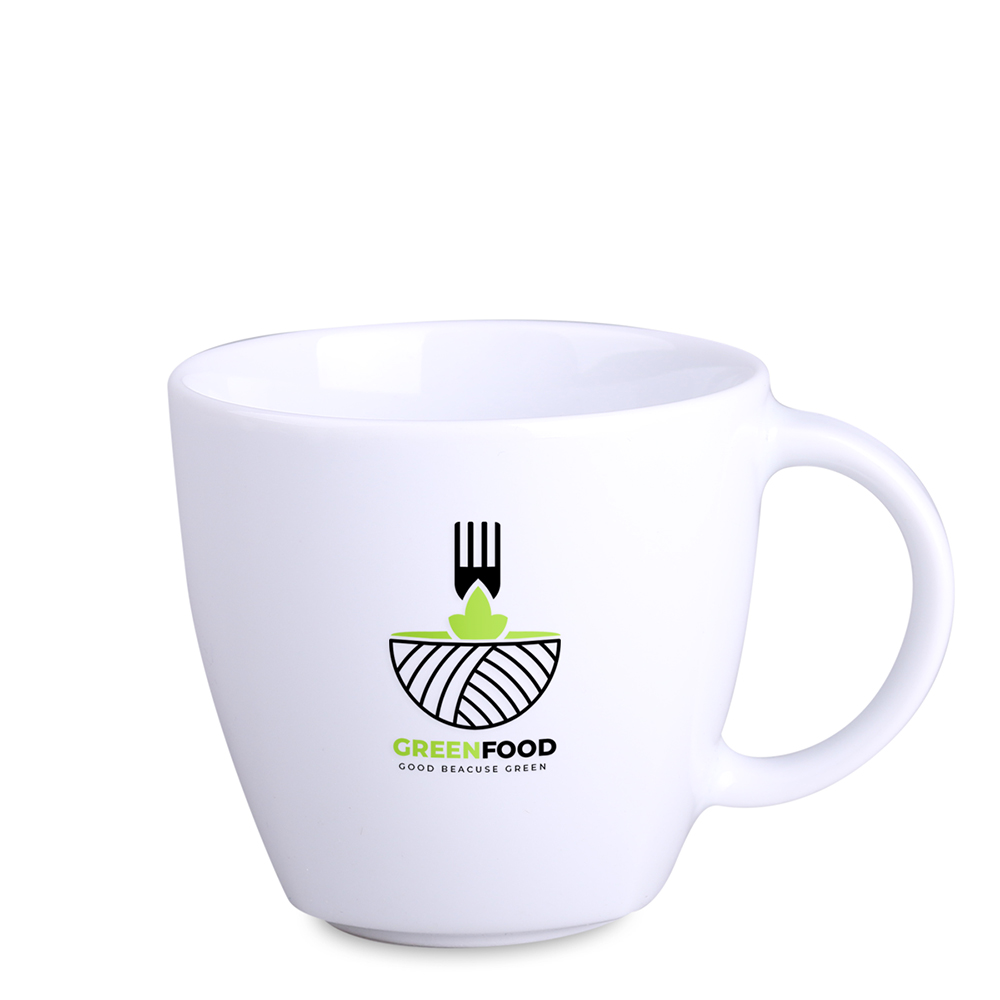 Porcelanowy kubek reklamowy dostępny w dwóch wersjach rozmiarowych. Cechą charakterystyczną tego fasonu są delikatne krawędzie widoczne w jego dolnej części.