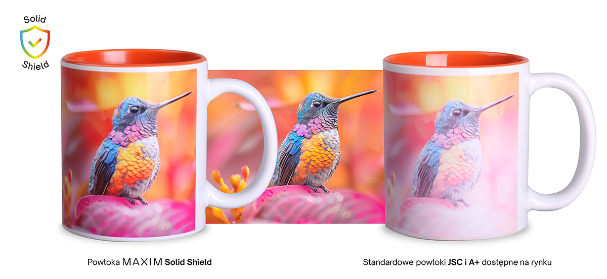 Specjalna powłoka polimerowa zapewniająca większą trwałość nadruku sublimacyjnego na mycie w zmywarkach.